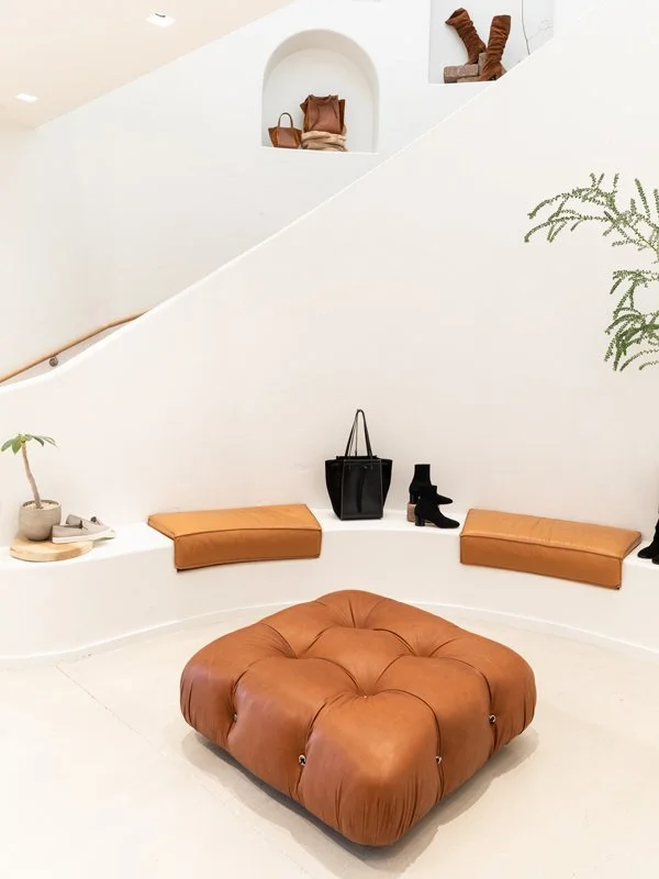 After a glass of wine, she asked us to help her with a new store concept. One week later, James showed up to Vince’s Hollywood offices with a handful of images and ideas. Caroline was excited to show him what she was thinking and shared her mood board…the images were almost exactly the same. The store was based loosely around Georgia O’Keefe’s Santa Fe home; walls were plastered in soft tones, corners were softened, seating was built in, and details of leather and bronze are throughout the space.